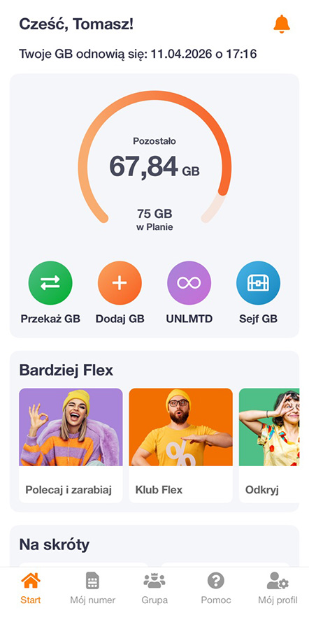 Dzielenie się GB – możesz przekazać część swoich gigabajtów innym użytkownikom Flexa. Albo odwrotnie – otrzymać GB od kogoś.