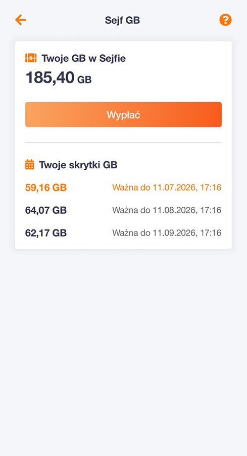 Sejf GB – niewykorzystane gigabajty nie przepadają. Automatycznie trafiają do sejfu, gdzie czekają na ciebie przez pół roku. Na moim koncie w sejfie zebrało się ponad 185 GB w trzech skrytkach – każda ważna pół roku od momentu, gdy trafiły tam niewykorzystane gigabajty. W każdej chwili mogę je wypłacić i dorzucić do bieżącej paczki.