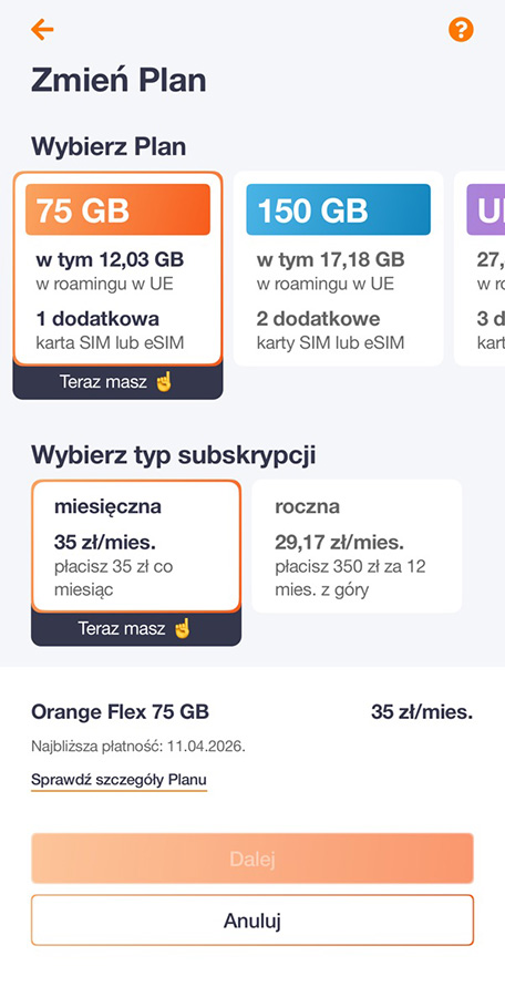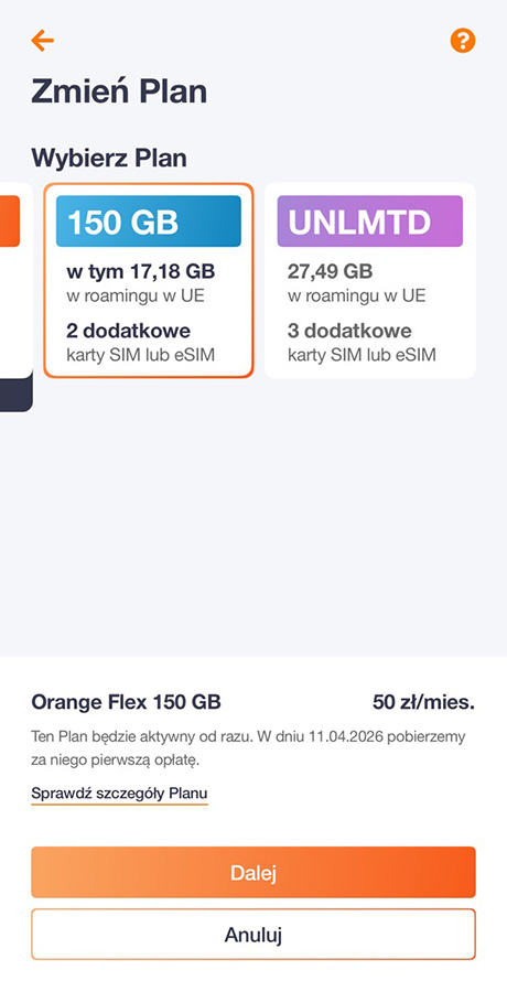 A co ze zmianą planu? Zrobiłem test w aplikacji. Wybrałem plan 150 GB i na dole ekranu pojawił się komunikat: „Ten Plan będzie aktywny od razu. W dniu 11.04.2026 pobierzemy za niego pierwszą opłatę.” Zmiana na wyższy plan działa więc natychmiast, ale płacisz dopiero przy kolejnym rozliczeniu (pamiętaj, że u każdego dzień rozliczenia jest inny). Zmianę na niższy plan też możesz zlecić w dowolnym momencie.